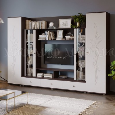 Гостиная Орхидея , Габариты (ШхВхГ): 3000х2050х540 мм, Ниша под ТВ (ШхВ): 1200х870 , Цвет: Белый матовый/венге . Стенка "Орхидея" - классическая мебель для гостиной, в модном, богатом дизайне. Вертикальные витрины, оснащенные гнутыми тонированными стеклостворками, придают модели изысканности. Фасады шкафов декорированы рисунком.