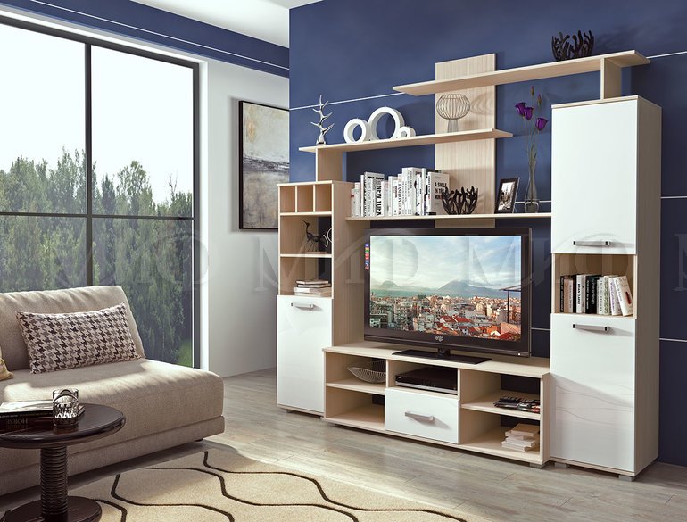 Ниша под ТВ (ШхВ): 1354х762 ммСветлая современная глянцевая гостиная с приятным дизайном. Мебельная горка для гостиной будет отлично смотреться на фоне более насыщенного по цвету интерьера, смягчая и осветляя его.